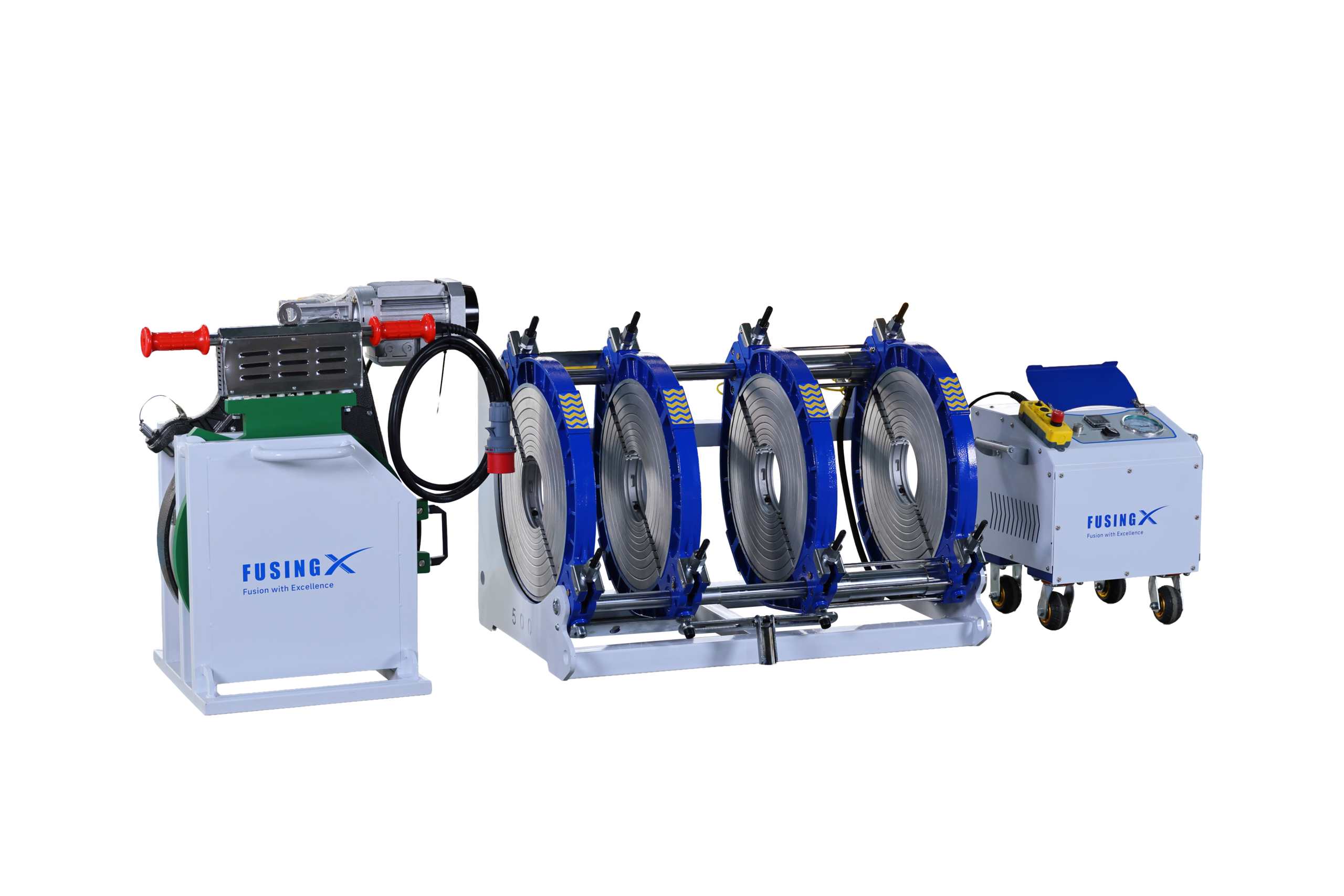 Equipo de termofusión Fusing FX500mm Premium para HDPE con sistema de control digital, ideal para soldaduras seguras en grandes proyectos.